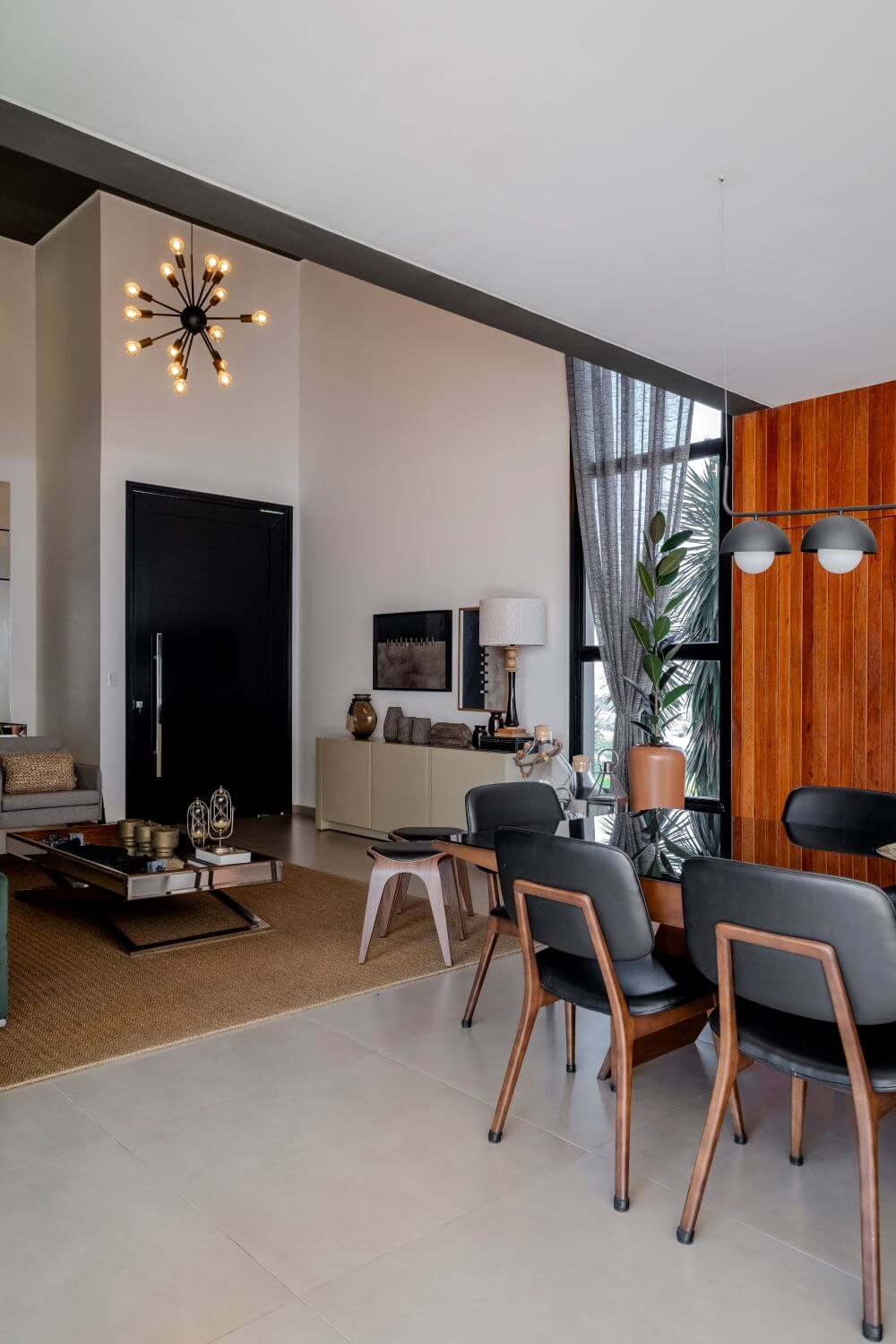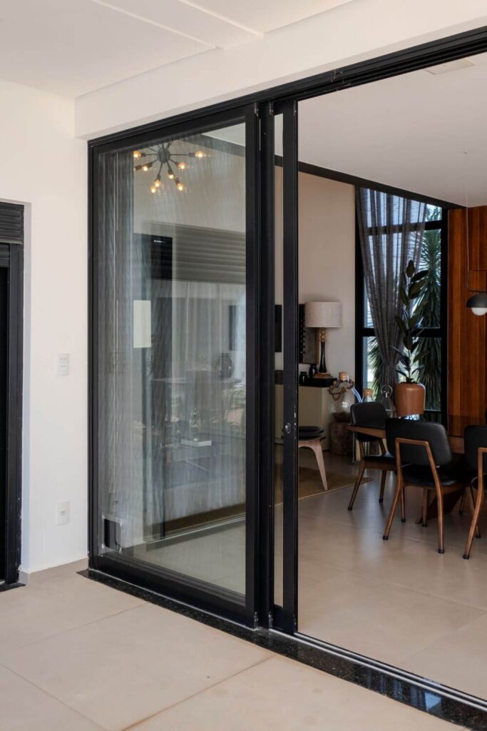 Explore esta residência em um design em forma única, destacando-se pelas portas e janelas de alumínio pretas, que definem cada abertura de maneira marcante. Ao substituir as janelas interiores por portas em esquadrias de alumínio, a casa integra perfeitamente os espaços internos e externos.
